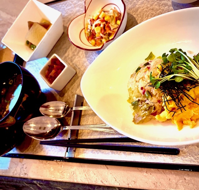 ビーフピラフ、コールスローサラダ、大根とこんにゃくの旨煮、マチェドニア寒天、お味噌汁、香の物 です。