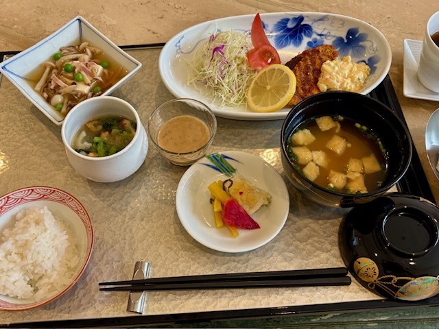 あじのフライ、豆腐キノコのあんかけ、おろし和え、味噌汁、香の物